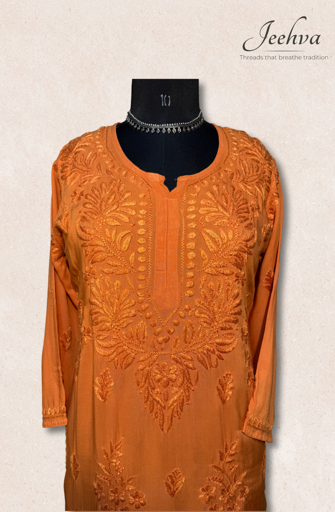 Step into elegance with our Modal Chikankari Long Kurti, where traditional craftsmanship meets luxurious comfort. Made from premium modal fabric, this kurti showcases intricate hand-embroidered Chikankari floral patterns that speak of the rich Lucknowi legacy. The soothing teal hue adds a serene, graceful vibe – perfect for any season or setting.
