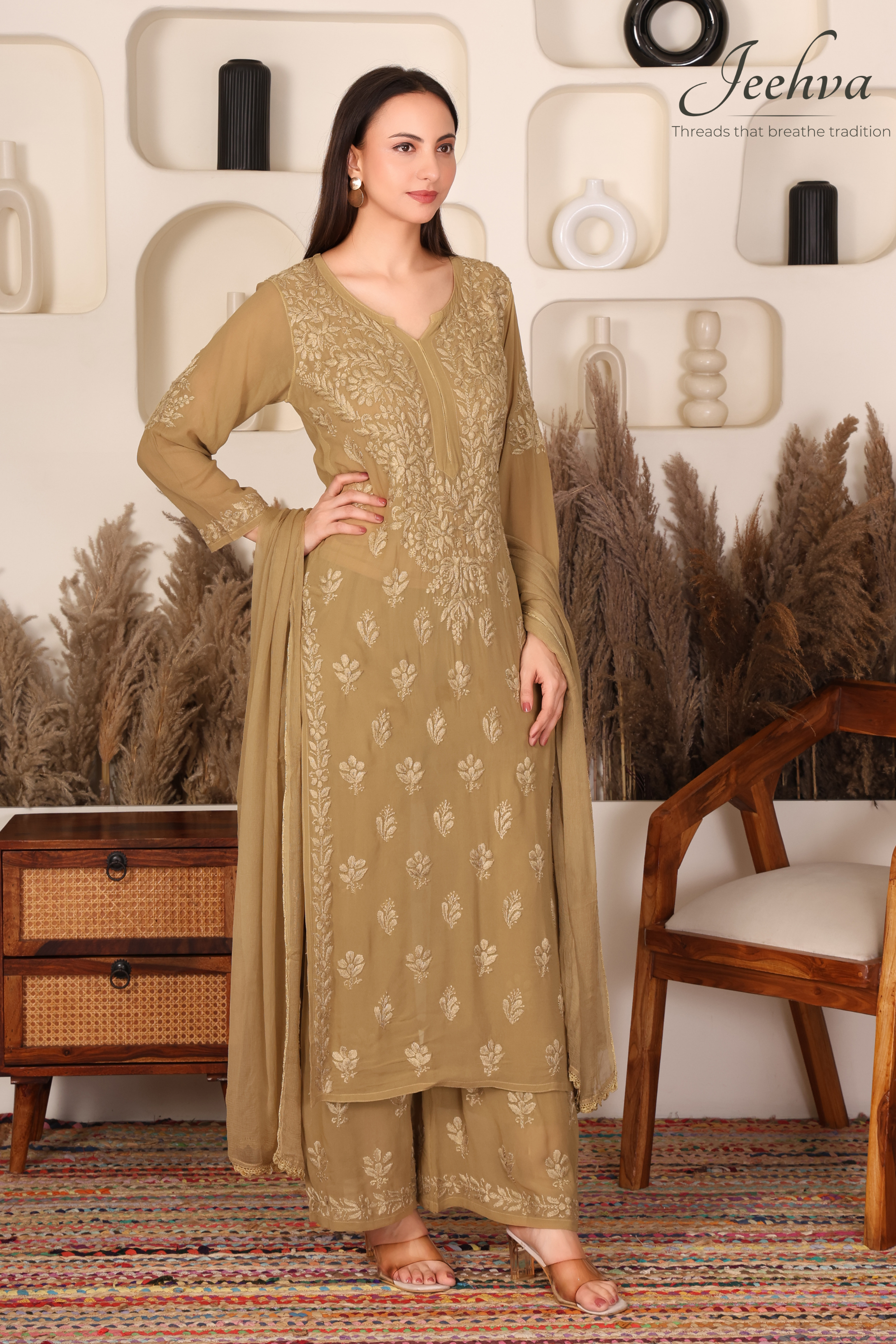Each Jeehva piece is lovingly handmade by skilled artisans. Slight variations in embroidery or threadwork are natural and reflect the unique beauty of artisan-made garments—no two pieces are ever exactly alike.